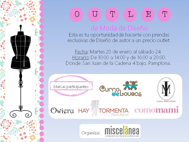Miscelánea organiza esta oportunidad de hacerte con prendas exclusivas de diseño de autor a un precio outlet. Tendrá lugar del martes, 20 de enero al sábado, 24 de enero de 10:00 a 14:00 y de 16:00 a 20:00 en San Juan de la Cadena 4, bajo, Pamplona.