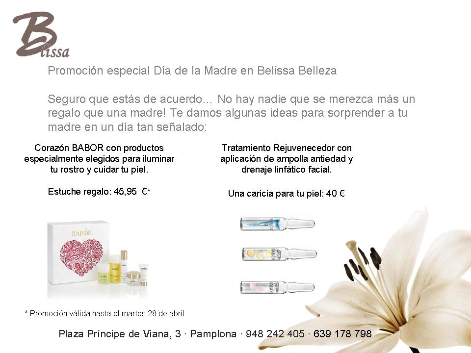 Belissa Belleza te da algunas ideas para sorprender a tu madre en un día tan señalado. Corazón BABOR con productos especialmente elegidos para iluminar tu rostro y cuidar tu piel. Estuche regalo: 45,95 ? (promoción válida hasta el martes 28 de abril). Tratamiento Rejuvenecedor con aplicación de ampolla antiedad y drenaje linfático facial. Una caricia para tu piel: 40 ?. Accede a la noticia para más información.