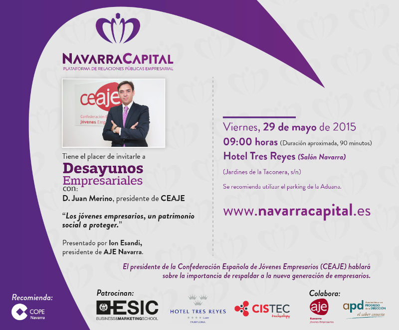 Tendrá lugar hoy, viernes 29 de mayo, a las 9:00 en el Hotel Tres Reyes. El presidente de la Confederación Española de Jóvenes Empresarios hablará sobre la importancia de respaldar a los nuevos empresarios.