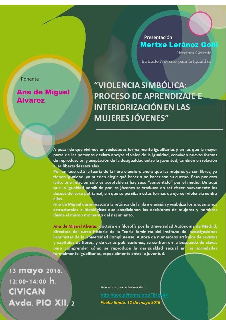 El Instituto Navarro para la Igualdad organiza esta jornada de acceso gratuito (previa inscripción) que tendrá lugar el próximo 13 de mayo de 12:00 a 14:00 en Civican (Avenida Pío XII 2; Pamplona). Inscripciones en https://docs.google.com/forms/d/1077Ia-IF1kQo1a6EvApnjhB2JyT5sBAeZFjmmft_o6Q/viewform?c=0&w=1