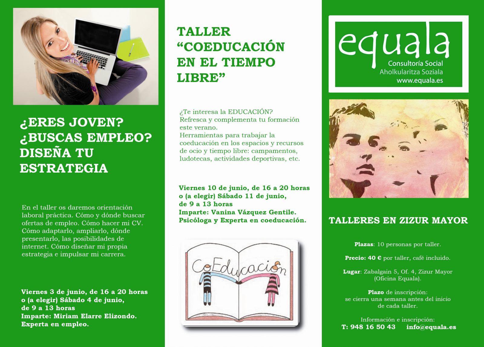 Estos talleres de 4 horas de duración tendrán lugar entre mayo y junio. Las temáticas son: "Creer y crear tu propia dieta", "¿Cómo reinventarse en el trabajo?", "¿Eres joven? ¿Buscas empleo? Diseña tu estrategia", "Cómo orientar a hijas e hijos en su futuro profesional", "Coeducación en el tiempo libre". Más información e inscripciones en el teléfono 948 16 50 43 y el el correo info@equala.es