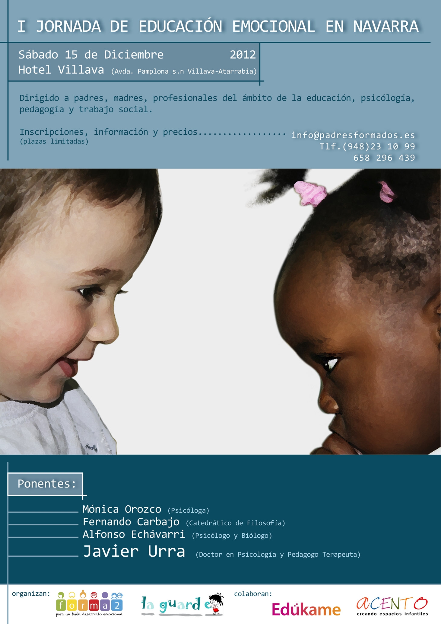 El próximo 15 de diciembre tendrá lugar en el Hotel Villava (Avd. Pamplona s/n), la I Jornada de Educación emocional en Navarra. El acto, dirigido a profesionales de la educación, de la psicólogía, del trabajo social, padres y madres, etc., contará con la participación del conocido Doctor en Psicología y pedagogo terapeuta, Javier Urra.