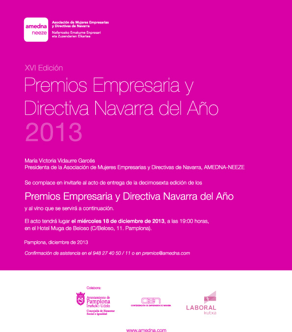 La entrega de galardones tendrá lugar el miércoles 18 de diciembre a las 19:00 en el Hotel Muga de Beloso. Si estáis interesadas en acudir, ya podéis confirmar vuestra asistencia en el teléfono 948 27 40 50 o bien en el correo electrónico premios@amedna.com