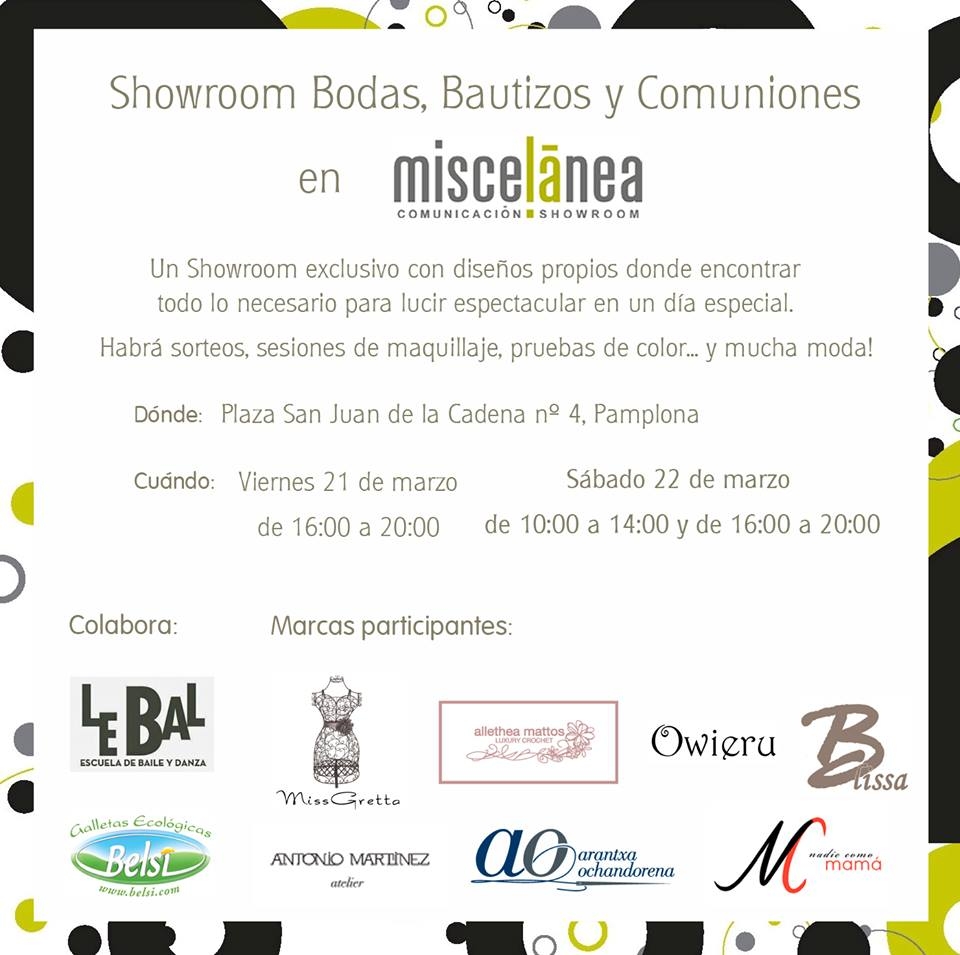 Miscelánea os invita al Showroom especial Bodas, Bautizos y Comuniones donde contaremos con la participación de marcas de ropa, complementos y joyas de diseño propio y exclusivo. Como no sólo la ropa es importante en un día especial, una maquilladora ofrecerá mini sesiones y consejos de maquillaje, y una personal shopper realizará Test de Color personalizados a todas aquellas que quieran descubrir cuáles son los colores que más les favorecen. Además, habrá un sorteo muy especial gracias a la colaboración de la Academia de Baile Lebal. Otras de las marcas participantes son MissGretta Creations, Allethea Mattos, Joyería Owieru, Arantxa Ochandorena, Belissa Belleza...