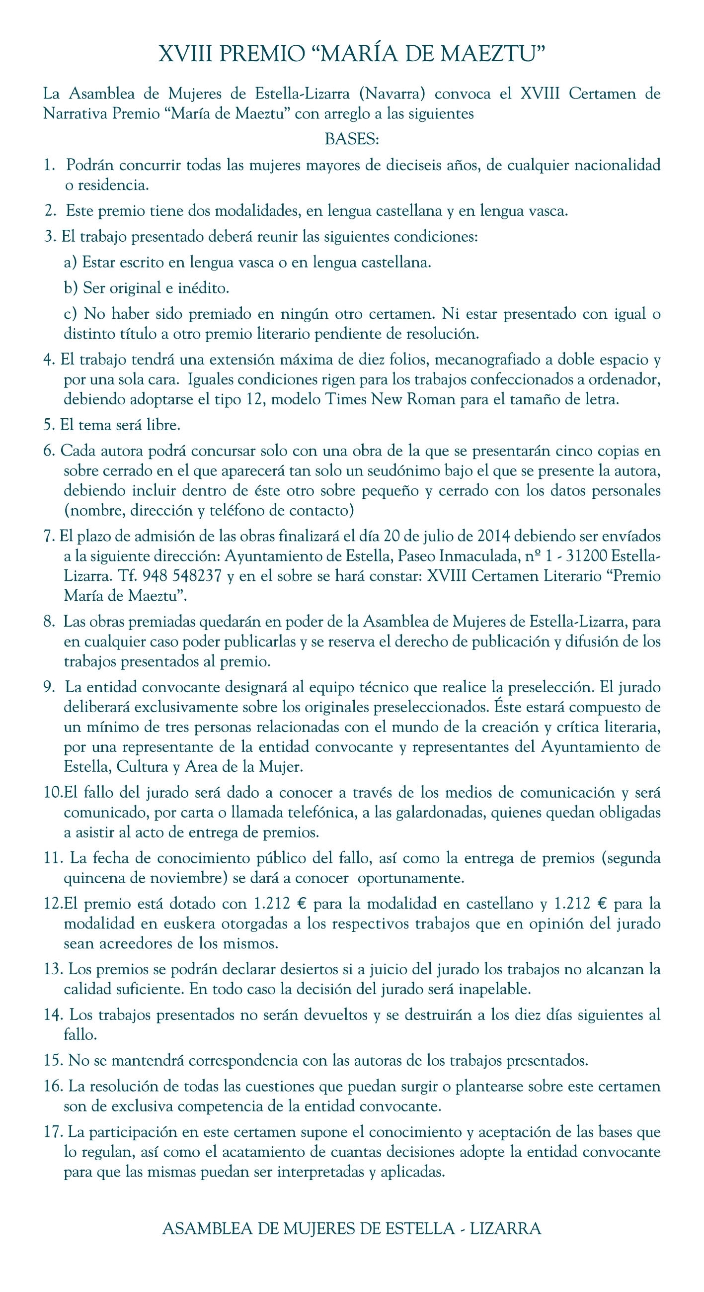 La Asamblea de Mujeres de Estella-Lizarra a través del Ayuntamiento de Estella convoca el XVIII Certamen de Narrativa "María de Maeztu". El tema es libre y el plazo de recepción de obras finalizará el 20 de julio de 2014.