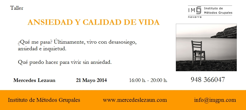 ¿Qué me pasa? Últimamente, vivo con desasosiego, ansiedad e inquietud. Qué puedo hacer para vivir sin ansiedad. Tendrá lugar el 21 de mayo de 2014 de 16:00 a 20:00. Más información en el 948366047 o en info@imgpn.com
