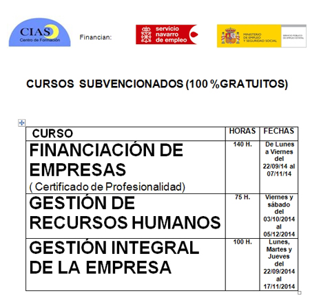 Los cursos, gratuitos y subvencionados por el Servicio Navarro de Empleo y el Ministerio de Empleo y Seguridad Social, son: Financiación de empresas, Gestión de recursos humanos y Gestión integral de la empresa. Estos comenzarán entre septiembre y octubre y finalizarán, dependiendo de la formación, entre noviembre y diciembre.