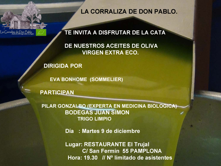 La asociada Luz Juanmartiñena de La Corraliza de Don Pablo tiene el placer de invitar a las asociadas de Amedna a una cata de sus aceites de oliva virgen extra eco con la participación de Eva Bonhome (sommelier) y Pilar Gonzalbo (Experta en medicina biológica). La cata tendrá lugar el 9 de diciembre a las 19:30 en el Restaurante El Trujal (C/San Fermín 55, Pamplona). Debido a las características de la cata el aforo es limitado. Reserva tu plaza en info@amedna.com o en el 948199529.