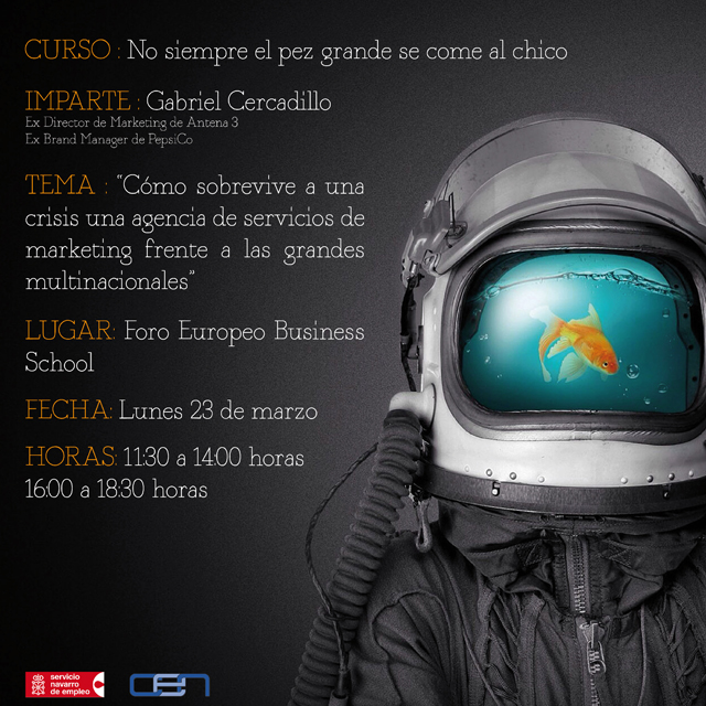 Tendrá lugar el lunes, 23 de marzo, de 11:30 a 14:00 y de 16:00 a 18:30 bajo el tema: Cómo sobrevive a una crisis una agencia de servicios de marketing frente a las grandes multinacionales. Impartido por Gabriel Cercadillo Exdirector de Marketing de Antena3 y ExBrand Manager de PepsiCo. Más información en 948 131 460 foroeuropeo@foroeuropeo.com