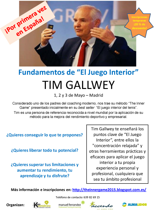 Tim Gallwey,  considerado uno de los padres del coaching y autor del best sellers como "El Juego Interior del Tenis”, “El juego Interior del Golf” o “El juego Interior del Trabajo",  llega a España con su modelo “Inner Game”, reconocido a nivel mundial por su aplicación durante más de 40 años en la mejora del rendimiento no sólo en el ámbito deportivo, sino sobre todo en el mundo empresarial.