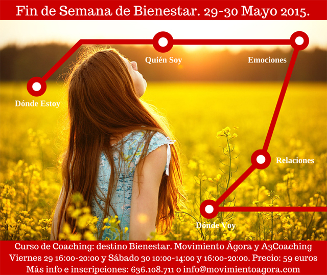 A3 Coaching y Movimiento Ágora organizan este curso que se centrará en atender algunos de los pilares que son la base de sentirse bien tener una idea de adónde vamos, de quién somos, profundizar en nuestras emociones y actitudes, en nuestra relación con el mundo y mucho más. La duración del curso es de 12 horas (viernes 29 de mayo de 16:00-20:00 y sábado 30 de mayo de 10:00-14:00 y de 16:00-20:00), precio: 59 euros. Más información e inscripciones 636108711 o en info@movimientoagora.com