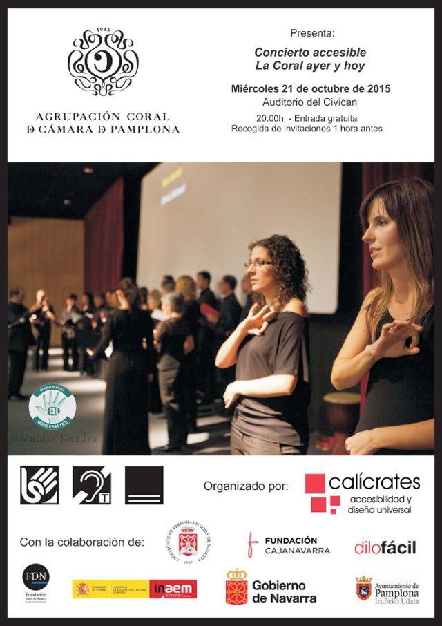 Es un concierto abierto a todo el público, para que con independencia de las capacidades de cada persona, se pueda disfrutar en condiciones de igualdad. Tendrá lugar en el Auditorio del Civican (Av. de Pío XII, 2) Pamplona el miércoles 21 de octubre de 2015 a las 20:00h. Entrada gratuita, recogida de invitaciones una hora antes.
