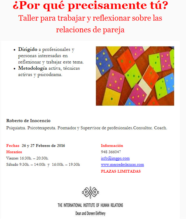 La asociada, Mercedes Lezáun, organiza este taller para trabajar y reflexionar sobre las relaciones de pareja (familia, elección, separación, conflictos, necesidades?) y que puede ser de utilidad tanto para personas interesadas como para profesionales. Tendrá lugar el 26 y 27 Febrero de 2016 en Bilbao con los siguientes horarios: viernes 16:30h. ? 20:30h., sábado 9:30h. ? 14:00h y 16:00h. ? 19:30h. Más información en 948 366047 o el info@imgpn.com