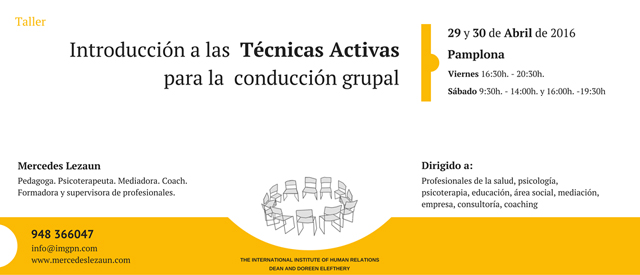 Tendrá lugar el 29 de 16:30 a 20:30 y 30 de abril de 9:30 a 14:00 y de 16:00 a 19:30. Dirigido a profesionales de la salud, psicología, psicoterapia, educación, área social, mediación, empresa, consultoría y coaching. Información e inscripciones en info@imgpn.com o en el 948366047.