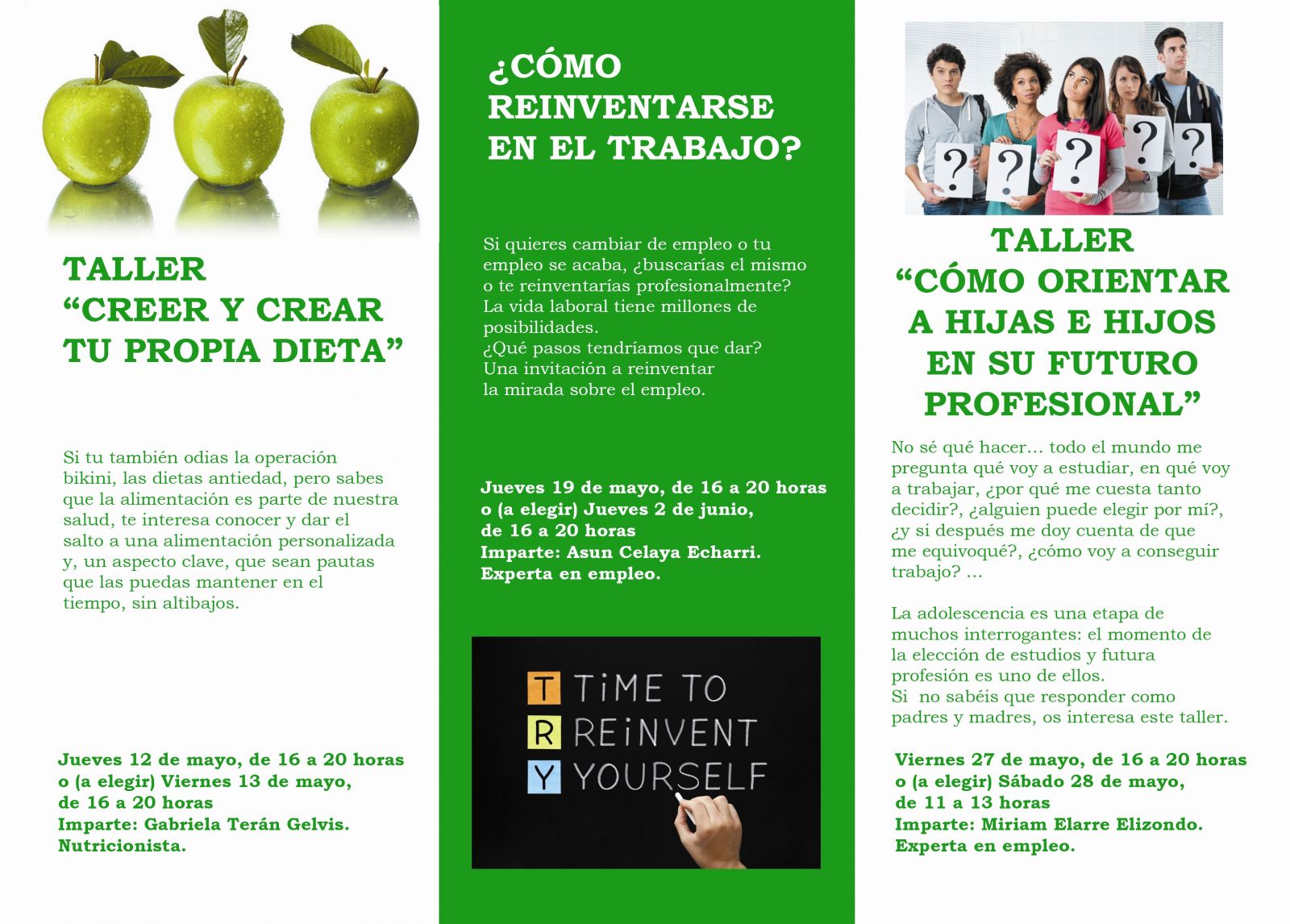 Estos talleres de 4 horas de duración tendrán lugar entre mayo y junio. Las temáticas son: "Creer y crear tu propia dieta", "¿Cómo reinventarse en el trabajo?", "¿Eres joven? ¿Buscas empleo? Diseña tu estrategia", "Cómo orientar a hijas e hijos en su futuro profesional", "Coeducación en el tiempo libre". Más información e inscripciones en el teléfono 948 16 50 43 y el el correo info@equala.es
