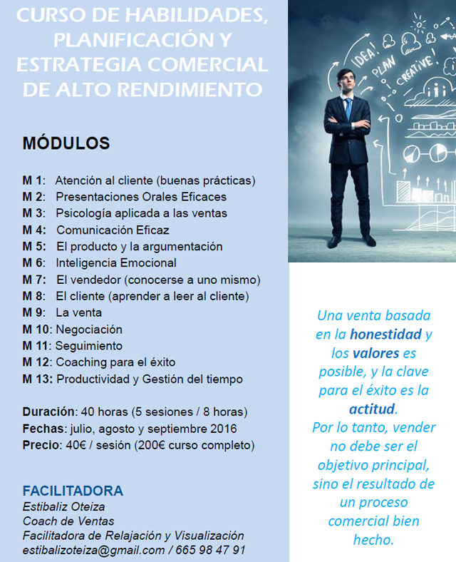 Con una duración de 40 horas distribuidas en 5 sesiones de 8 horas, tendrá lugar entre julio, agosto y septiembre. Cada sesión tiene uno coste de 40 euros y el curso completo de 200 euros. La facilitadora será Estibaliz Oteiza, coach de ventas y facilitadora de Relajación y Visualización. Para más información estibalizoteiza@gmail.com o en el teléfono 665 98 47 91.