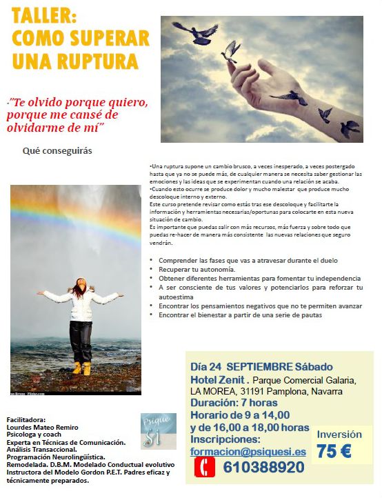 Tendrá lugar el sábado, 24 de septiembre, en el Hotel Zenit (Parque comercial Galaria, La Morea). La duración es de 7 horas en un horario de 9:00 a 14:00 y de 16:00 a 18:00, con un precio de 75 euros. Inscripciones en formacion@psiquesi.es o en el teléfono 610388920.