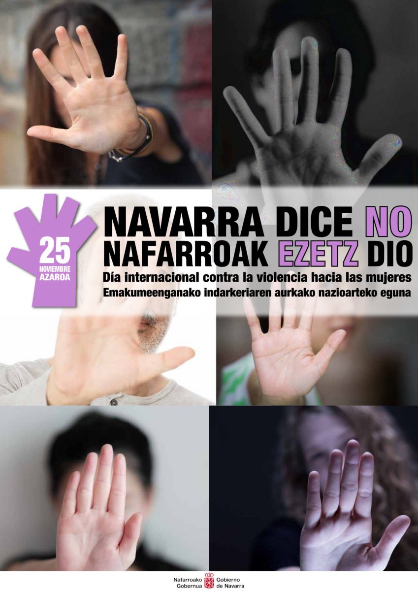 El Instituto Navarro para la Igualdad impulsa la Campaña del 25 noviembre, Día Internacional contra la violencia hacia las mujeres. El objetivo es sensibilizar a toda la ciudadanía navarra en el rechazo de la violencia contra las mujeres. Para ello, entre otras acciones, se ha elaborado un cartel específico dirigido a la campaña, que contiene como mensaje textual “NAVARRA DICE NO”, y como símbolo, la mano lila. Se ha elegido este lema reforzando la respuesta social ante las agresiones sexistas que Navarra ha mostrado en los últimos meses.