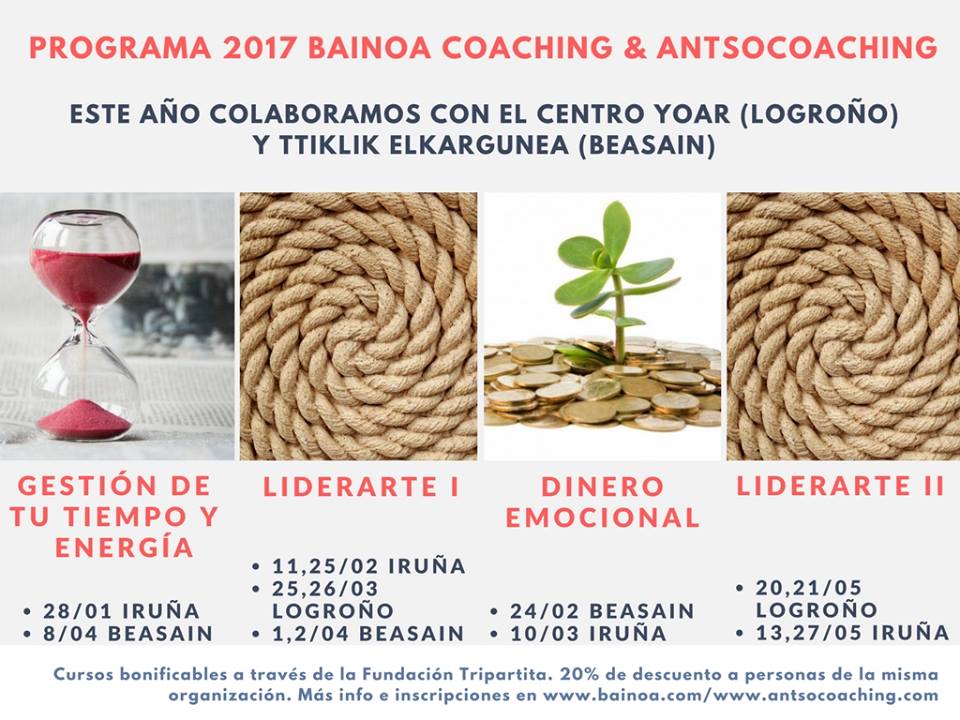 Desde Bainoa Coaching presentan esta nueva propuesta de talleres con ganas de compartir y aprender. Entre otros destacan "Gestión de tu tiempo y energía", "Liberarte", "Dinero emocional". Bonificable a través de la Fundación Tripartita. 20% descuento para personas de la misma organización. Accede a la noticia para consultar fechas y lugares de impartición.