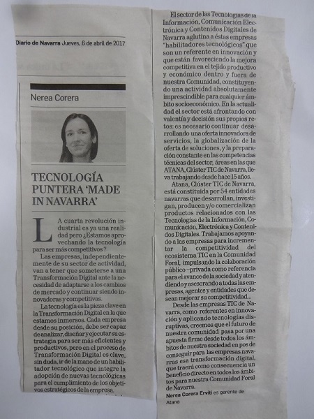 Nerea Corera, gerente de ATANA escribe sobre tecnología puntera "made in Navarra" en Diario de Navarra