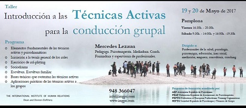 Taller Técnicas Activas Mercedes Lezaun de Lefer imparte en Pamplona, los días 19 y 20 de mayo próximos, un taller sobre Técnicas Activas. El taller está dirigido a profesionales de la salud, psicología, psicoterapia, educación, área social, mediación, empresa, consultoría y coaching.