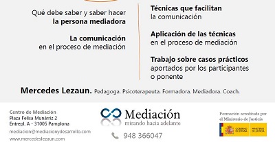 Mercedes Lezaun, de Lefer, imparte este curso práctico de "Técnicas para la mediación" de 16.00 a 20.00 horas. En él se reflexionará sobre qué debe saber y saber hacer la persona mediadora, y sobre las técnicas que facilitan la comunicación y su aplicación en el proceso de mediación.