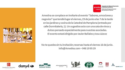 Amedna se complace en invitarte al evento “Sabores, emociones y negocios” que tendrá lugar el viernes, 23 de junio a las 7 de la tarde en los jardines y cocina de la Catedral de Pamplona (entrada por calle Dormitalería, 1). Un sugestivo acto con una cata de vinos y dulces pensado especialmente para nuestras asociadas.