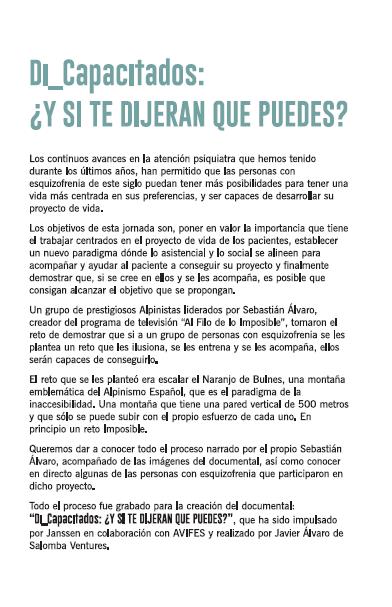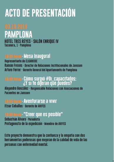Desde Elkarkide, Cristina Jauregi nos invita a la proyección del documental “DI_Capacitados ¿Y si te dijeran que puedes?”, realizado por el creador del programa "Al Filo de lo Imposible", Sebastián Alvaro, con la colaboración de AVIFES (Asociación Vizcaína de familiares y personas con enfermedad mental) y patrocinado por Janssen. La proyección tendrá lugar el miércoles 3 de octubre a las 18:30 horas en el Hotel 3 Reyes de Pamplona.