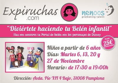 Este curso para niños y niñas a partir 6 años, en el que Expi Aguilera les enseñará a crear un portal de Belén con los personajes de Disney, tendrá lugar los martes del mes de noviembre por la tarde en Pío XII, 4 bajo. Así, en horario de 17:30 a 19:00 horas, los días 6, 13, 20 y 27 de este mes la chiquillería podrá disfrutar de un buen rato haciendo belenes.
