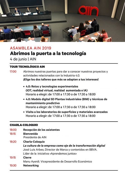 La Asociación de la Industria Navarra celebra el martes 4 de junio a las 17:00 su asamblea anual y una jornada de puertas abiertas bajo el título “Abrimos la puerta a la tecnología”. Susana Otazu, responsable de formación de AIN transmite la invitación a todas las asociadas de Amedna para asistir a estos actos. En el curso de la jornada, José Luis Arbeo “Director de Marca y Contenidos de BBVA” impartirá una charla y posteriormente se dará un momento de “networking”.