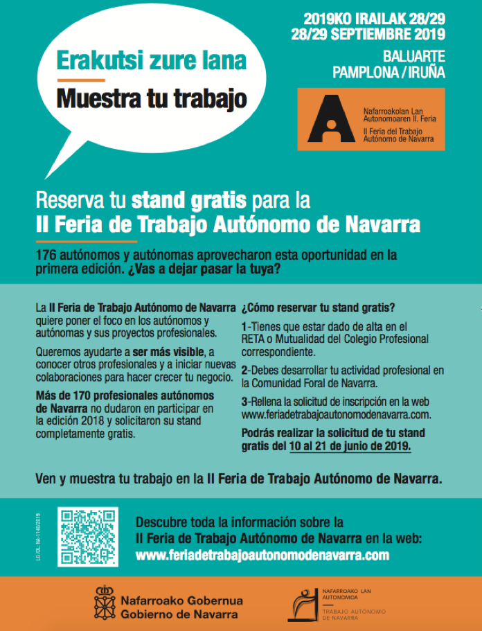 La II Feria del Trabajo Autónomo de Navarra tendrá lugar en Baluarte (Plaza Baluarte, s/n. 31002 Pamplona) los días 28 y 29 de septiembre de 2019.