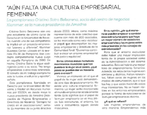 Cristina Sotro Belzarena aún era una estudiante de último curso de Derecho en la Universidad de Navarra cuando uno de sus compañeros la implicó en un proyecto empresarial “pionero y diferente”, Klammer Business Center, ubicado en la avenida Pío XII de Pamplona. Ese concepto completamente nuevo cuajó en aquella Pamplona de 1990. De hecho, Cristina Sotro lo sigue codirigiendo junto a su socio. “No tengo empresarias o directivas referentes. El leimotiv de mi trabajo siempre ha sido la ilusión, el esfuerzo y apostar”, señala.