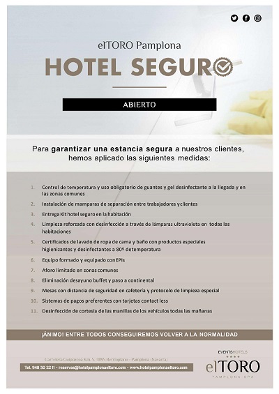 Sara Martínez, directora de Hotel El Toro Hotel & Spa pone en nuestro conocimiento que el hotel ya está operativo, por haber sido incluido en la relación de establecimientos turísticos de Navarra colaboradores para servicios esenciales. Las instalaciones y el personal siguen escrupulosamente los estándares y protocolos de higiene y seguridad, tal y como se recogen en el documento que podéis leer en el interior de la noticia, garantizando una atención segura para todos los clientes.