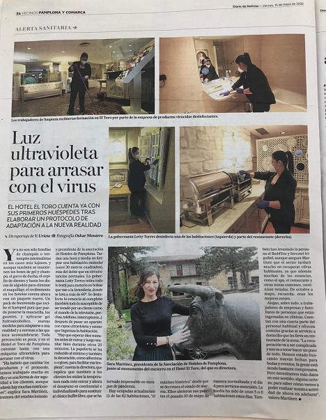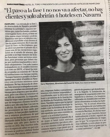 Los medios de comunicación locales se han hecho eco de la apertura del Hotel Spa Pamplona El Toro, al ser uno de los cuatro establecimientos hoteleros de Navarra abiertos desde la Fase 1 para proporcionar alojamiento a trabajadores esenciales. Sara Martínez, directora del hotel y presidenta de la Asociación de Hoteles de Pamplona nos indica que la ocupación es actualmente baja, pero ya en la Fase 2 empiezan a tener demanda para salas de reuniones por parte de las empresas que buscan espacios amplios donde celebrar reuniones presenciales y confía en que el entorno natural y el buen sistema sanitario de Pamplona hagan que remonte la demanda turística en Navarra.