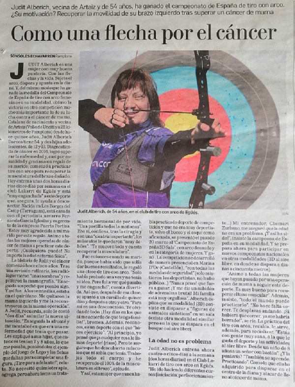 Gerente de Puertas y Automatismos Portisa S.L Judith Alberich comenzó a practicar este deporte tras superar un cáncer de mamá y querer recuperar la musculatura del brazo después de la operación. El pasado 20 de marzo se presentó al “Campeonato de España 3D Sala” con arco desnudo en categoría de mujeres y resultó ganadora. Desde Amedna le damos la enhorabuena. Os dejamos la referencia aparecida en la prensa local.