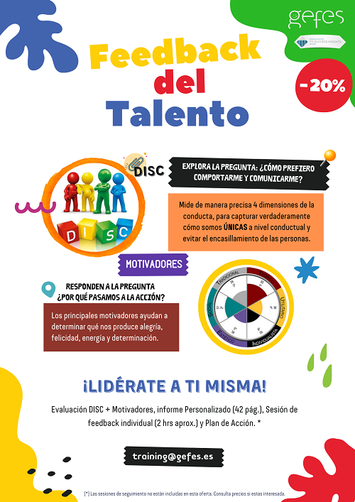 Explora la pregunta ¿Cómo prefiero comportarme y comunicarme? Mide de manera precisa 4 dimensiones de la conducta para capturar verdaderamente cómo somos únicas a nivel conductual y evitar el encasillamiento de las personas. Mayalen Itoiz, directora de Gefes nos ofrece esta propuesta que consta de: 1 evaluación DISC + Motivadores, 1 informe personalizado de 42 páginas y 1 sesión individual para trabajar los resultados de 2 horas aproximadamente. Las asociadas de Amedna interesadas cuentan con un 20% de descuento.