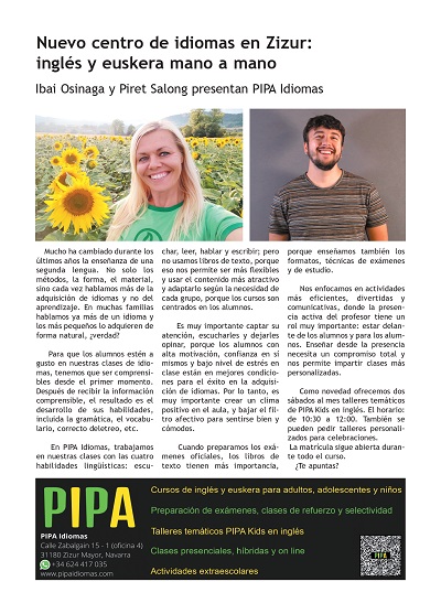 PIPA IDIOMAS es un centro de idiomas donde se imparten clases de euskera e inglés para diferentes niveles y edades. Se prepara para exámenes oficiales y la selectividad; imparten también clases de apoyo para niños y adolescentes y dan clases generales para mejorar la fluidez y la comprensión de los idiomas.
