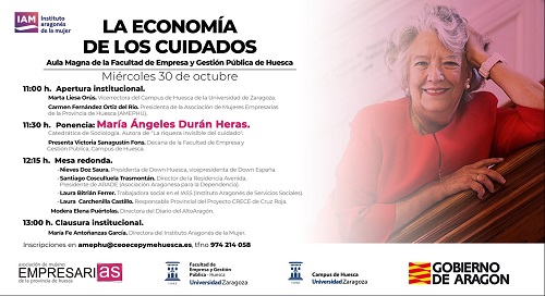 Dentro del apartado “Amedna en red” esta semana informamos sobre la jornada “La economía de los cuidados” que organiza AMEPHU el próximo 30 de octubre en jornada presencial y “on line”. Mª Ángeles Durán Heras, Catedrática de Sociología y autora de la obra “La riqueza invisible del cuidado” impartirá la ponencia principal, seguida de una mesa redonda con representantes de asociaciones de Cruz Roja, Síndrome Down de Huesca, del Instituto Aragonés de Servicios Sociales y de la Asociación Aragonesa para la Dependencia. Programa completo e información para inscribirse en el interior de la noticia.