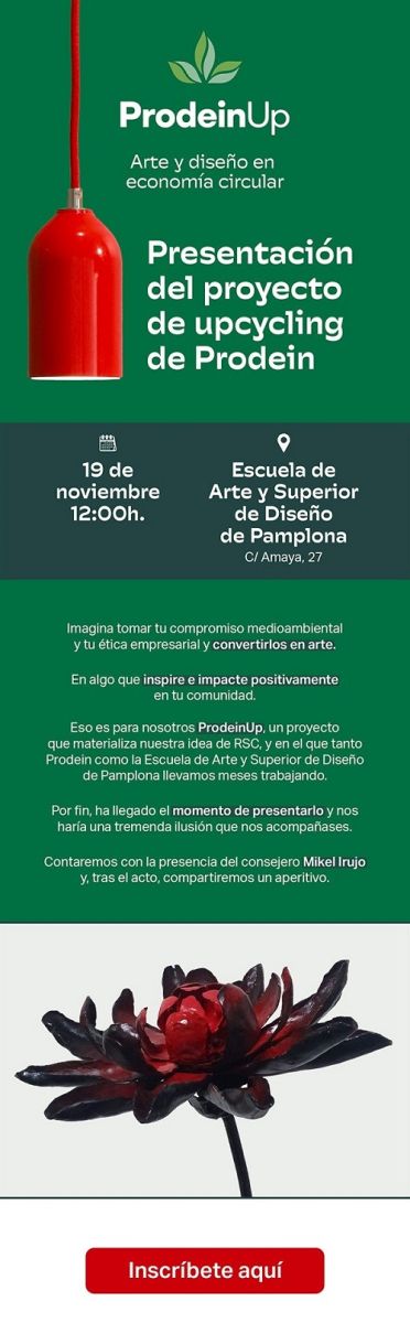 ProdeinUp es un proyecto innovador que fusiona el arte y el diseño con la economía circular; este proyecto nace como consecuencia de la inquietud de Sonia Moneo, directora general de Prodein de hacer «empresa de otra manera», como reto ante un problema -los residuos del sector- y con la ilusión de aportar una pequeña parte de la solución. La presentación de este programa tendrá lugar el martes 19 de noviembre a las 12:00h en la Escuela de Arte de Pamplona. Más información en el interior de la noticia.