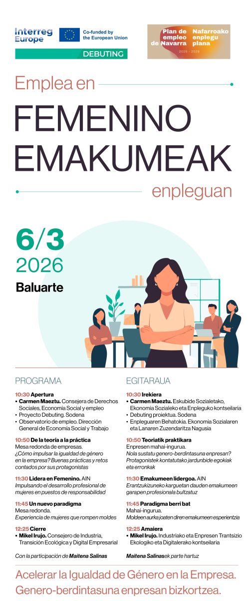 Dentro de la iniciativa Debuting, de la que AMEDNA/NEEZE forma parte, hoy viernes tendrá lugar una jornada sobre el impulso de la igualdad de género en la empresa; en la jornada a través de dos mesas redondas se mostrarán buenas prácticas y retos enfrentados por las empresas, así como experiencias de mujeres que han roto moldes y también se expondrá el programa Lidera, que impulsa el desarrollo de mujeres en puestos de responsabilidad. En esta jornada, organizada por Sodena, intervendrán Carmen Maeztu, consejera de Derechos Sociales, Economía Social y Empleo y Mikel Irujo, consejero de Industria, Transición Ecológica y Digital Empresarial. Programa de la jornada e inscripciones en el interior de la noticia.
