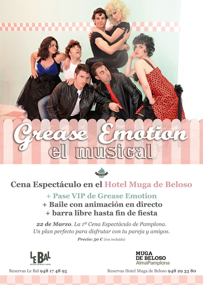 El próximo viernes 22 de Marzo se celebrará una Cena Espectáculo en el Hotel Muga de Beloso con un pase VIP para el musical Grease Emotion a cargo de la Compañía Le Bal. Un plan perfecto para la noche del viernes que podrás disfrutar con tu pareja y amigos en un entorno incomparable. Degusta una suculenta cena y diviértete con un musical que hará vibrar el escenario hasta acabar la noche con un baile con animación en directo y barra libre. No te lo puedes perder. Reserva ya tu entrada en Le Bal 948 17 48 95 o en el Hotel Muga de Beloso 948 29 33 80.