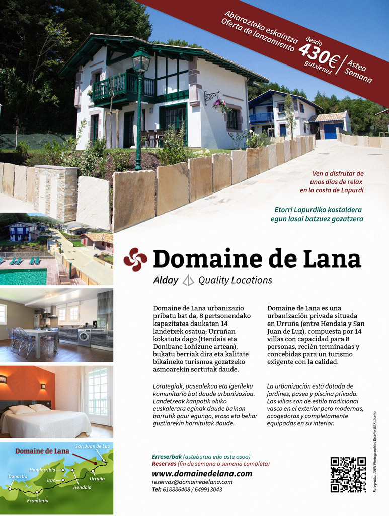 Domaine de Lana es una urbanización privada compuesta de 14 villas de estilo vasco con capacidad para 8 personas, construidas en 2013 y pensadas especialmente para un turismo tranquilo y exigente con la calidad.